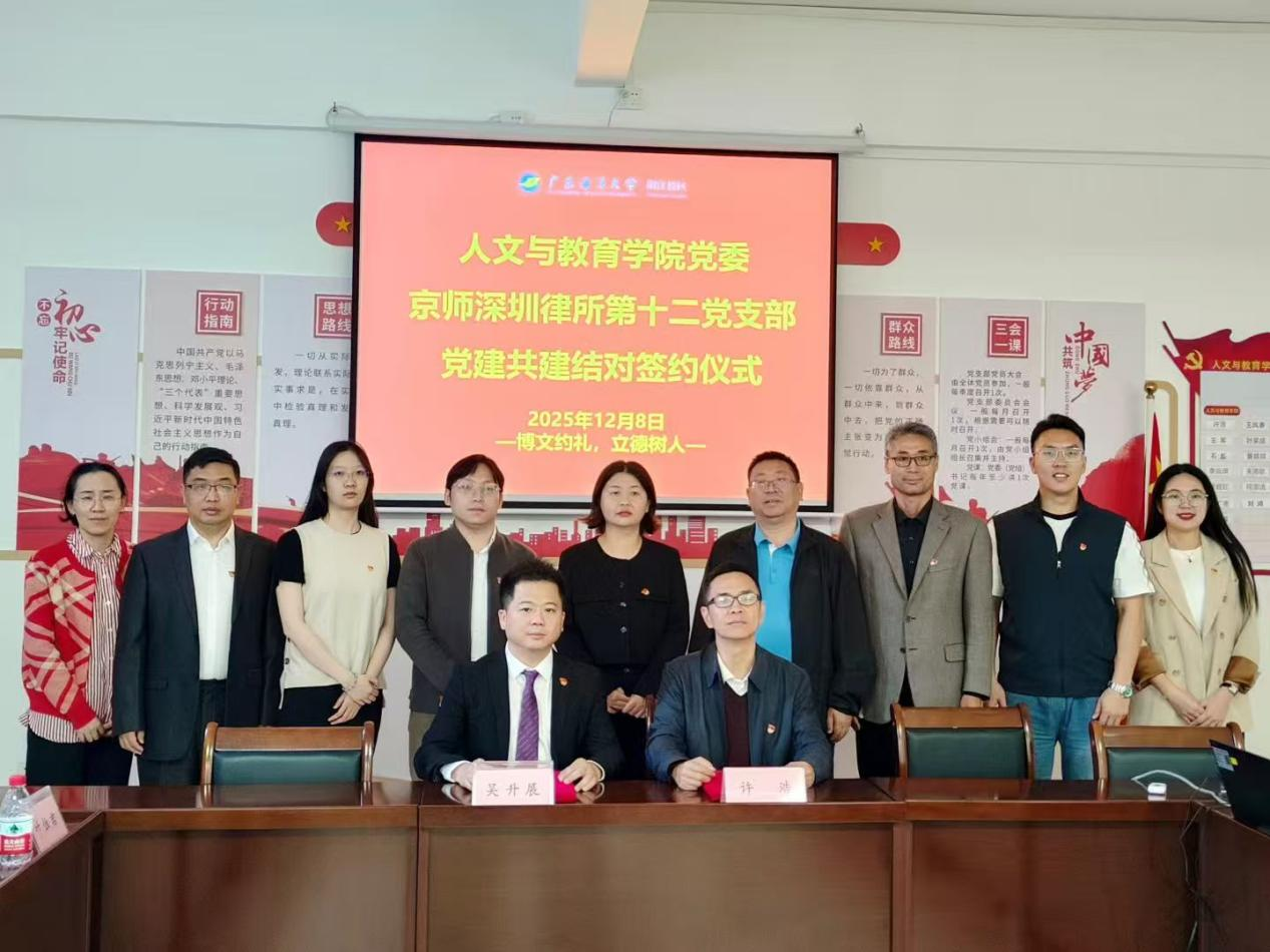 william威廉中文官网始终秉持“博文约礼立德树人”院训,深耕人文教育领域,在人才培养、学科建设与社会服务中持续发力。此次结对共建,学院立足宪法宣传教育的重要契机,旨在以党建引领推动教育资源与法律资源深度融合。京师深圳律师事务所第十二党支部坚守“党建促所建、专业报社会”的发展理念,其所在律所党组织已累计与80余家单位建立共建关系,在“法治+教育”领域积累了丰富的实践经验和优质资源,具备深厚的专业服务能力与强烈的社会责任感。